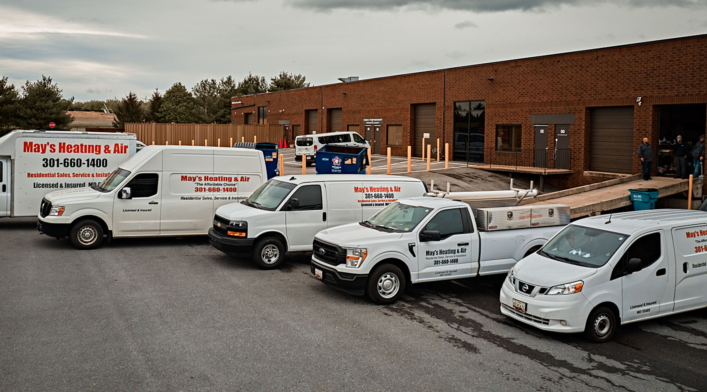 Coordinated lettering and graphics across all vehicle types — vans, trucks, and trailers.